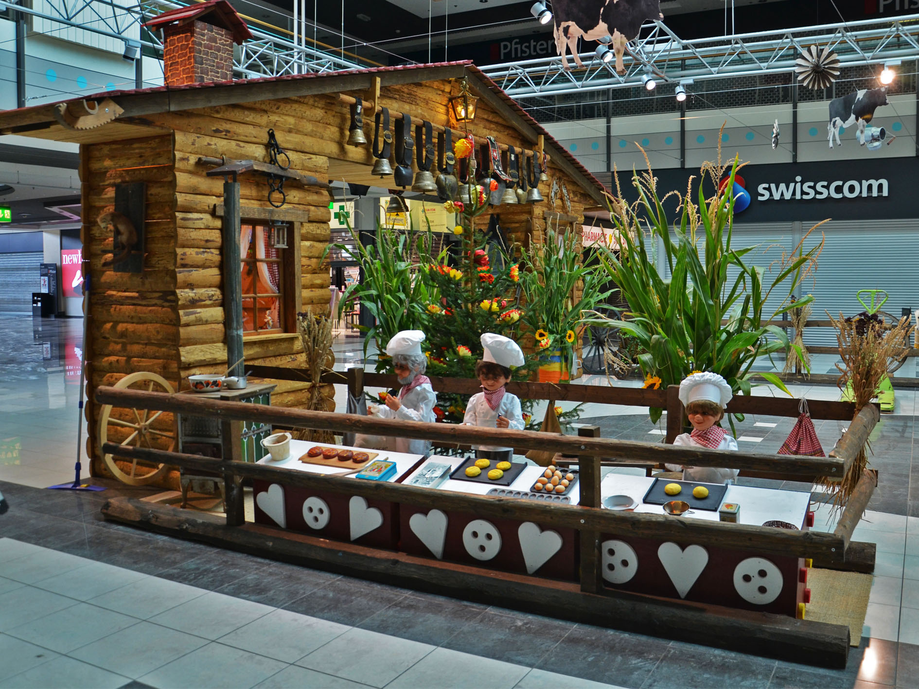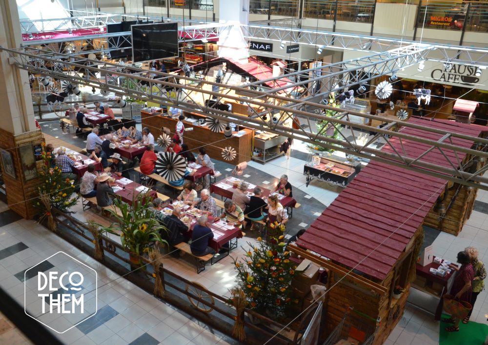 Mise en scène du terroir : Installation de chariots et d'étals de présentation pour valoriser les produits artisanaux et les spécialités culinaires.