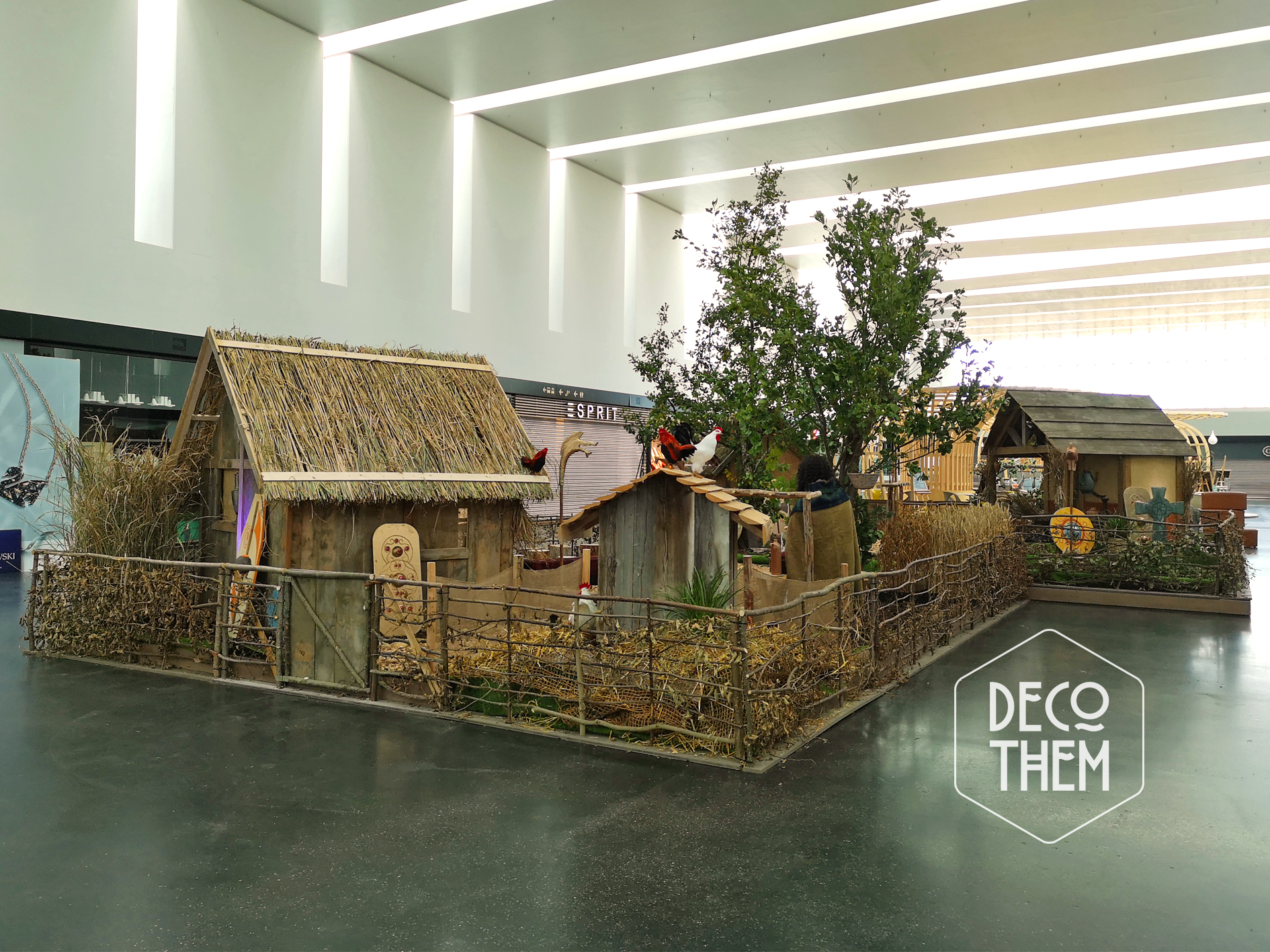 Reconstitution de cabanes traditionnelles : Des structures réalisées avec des matériaux authentiques comme le bois recyclé, le torchis et les roseaux, pour un rendu visuel d'un réalisme saisissant.
